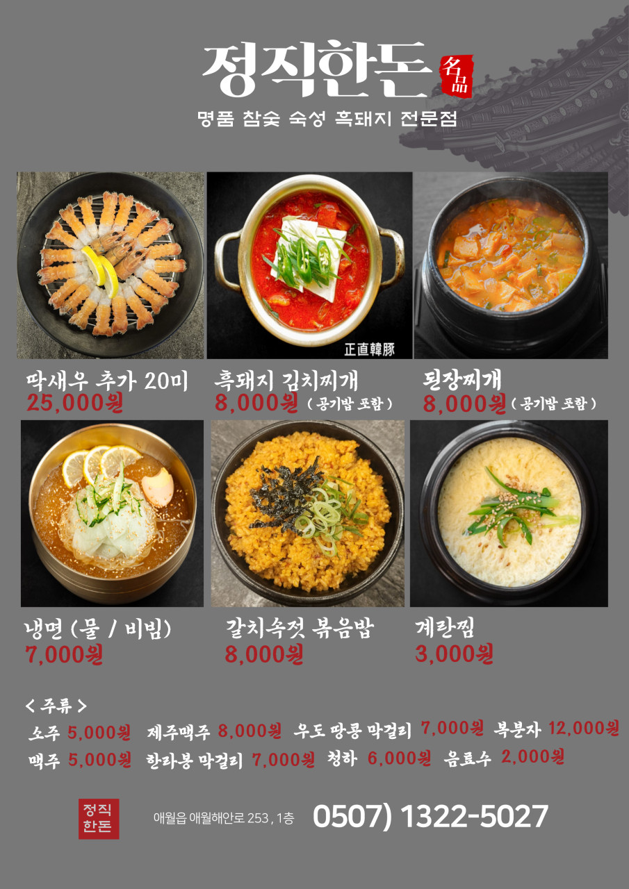 제주 정직한돈은 애월이 본점이고 한립협재 / 서귀포중문에도 체인점이 있습니다.