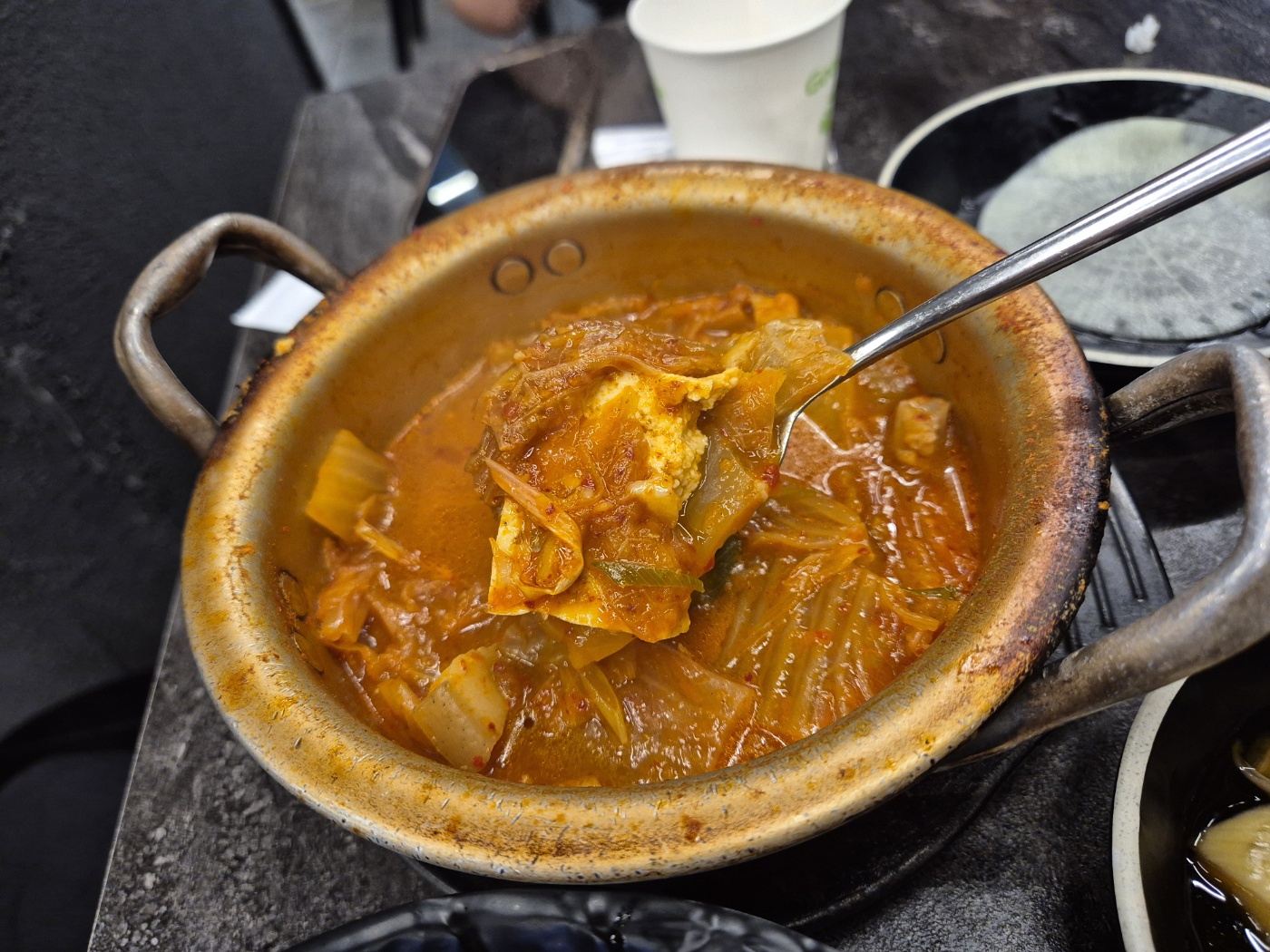 고기를 먹고 있으니 주문한 김치찌개가 나왔습니다.